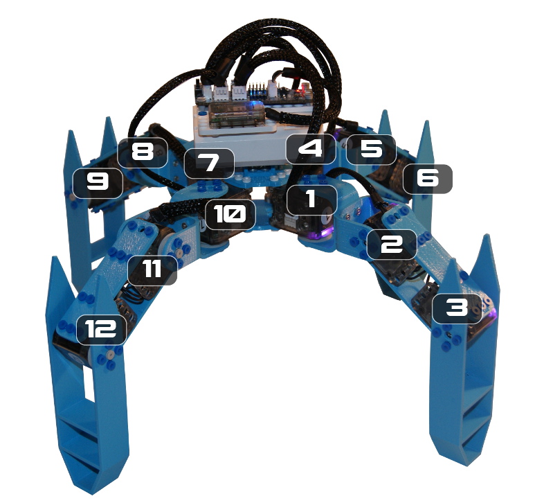 Votre patte doit être droite en position zero (cf encoche ci-dessus). Lorsque tous vos servomoteurs sont en position zéro, votre robot devrait ressembler à cela.