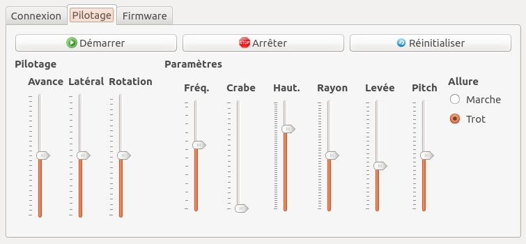Vous pouvez agir sur les ordres à gauche (Avance, Latéral et Rotation), et aussi sur les paramètres de la marche à droite.
